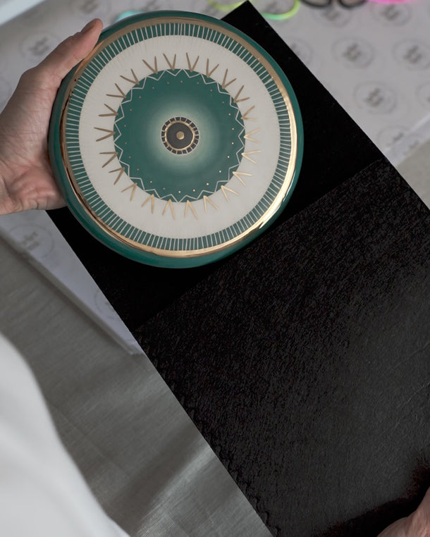 After modeling from first class quality ceramic clay, it is fired for the first time, for the second time for the glaze, and for the third time for the unique golden gilding shine.