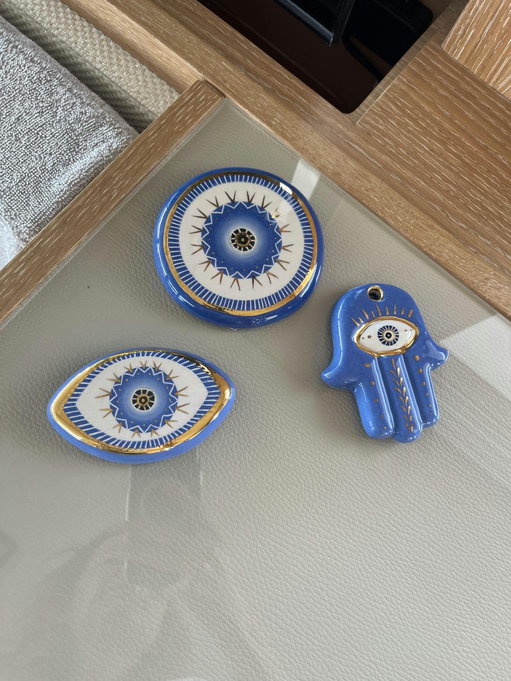 Eye-shaped amulets are produced in two different sizes and each is sold with its own gift bag.